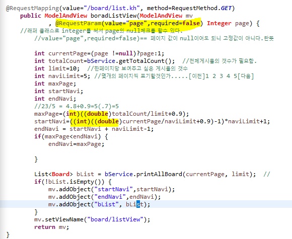 CONTROLLER 페이징 처리와 리스트 가져오는 것을 동시에 함.