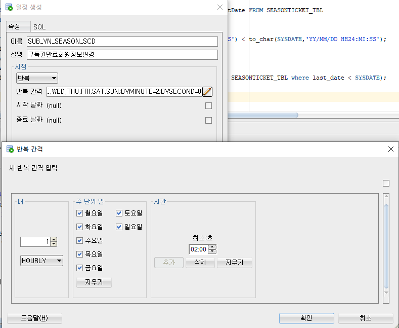 , END_DATE => NULL, // 만료시간...영구반복이면 NULL 7일이면 TRUNC(SYSDATE+7)
