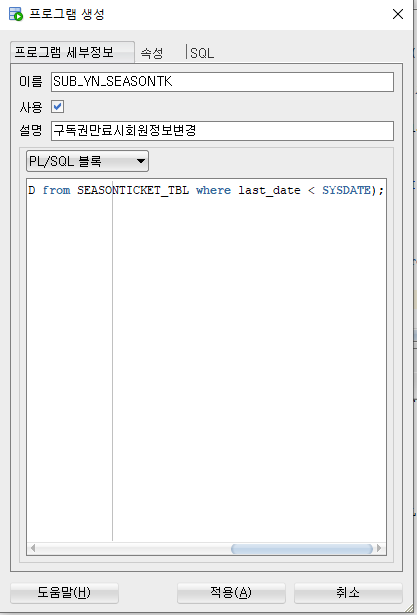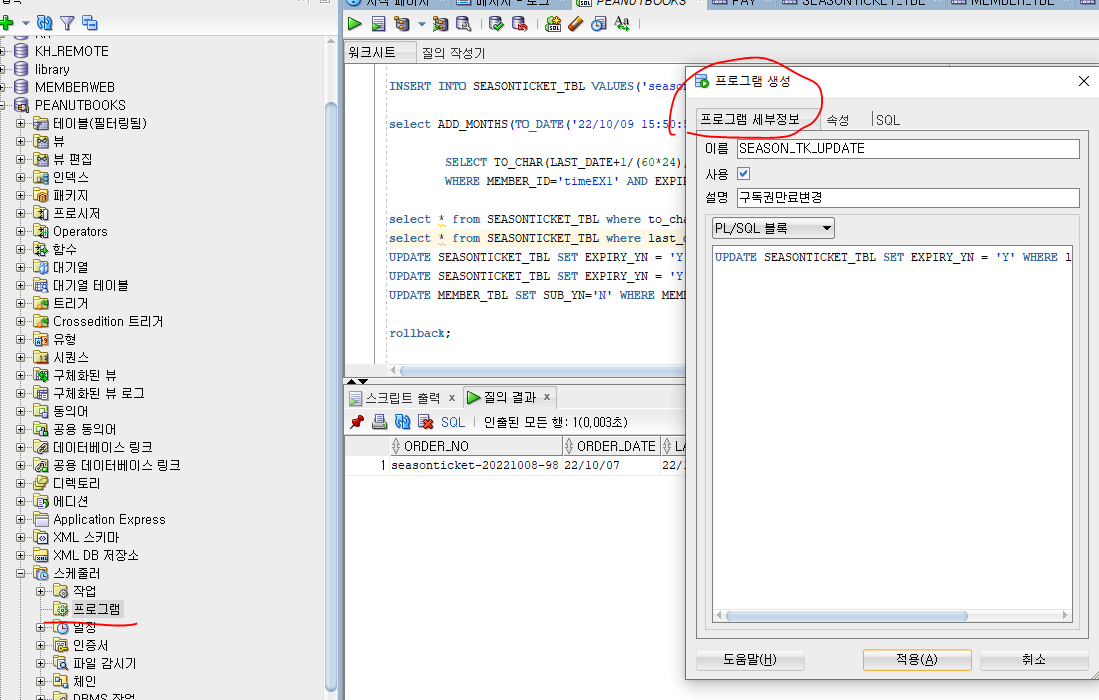 계정은 PEANUTBOOKS// 테이블은 SEASONTICKET_TBL의 EXPIPY_YN 를 Y로 변경//기간만료로 변경//