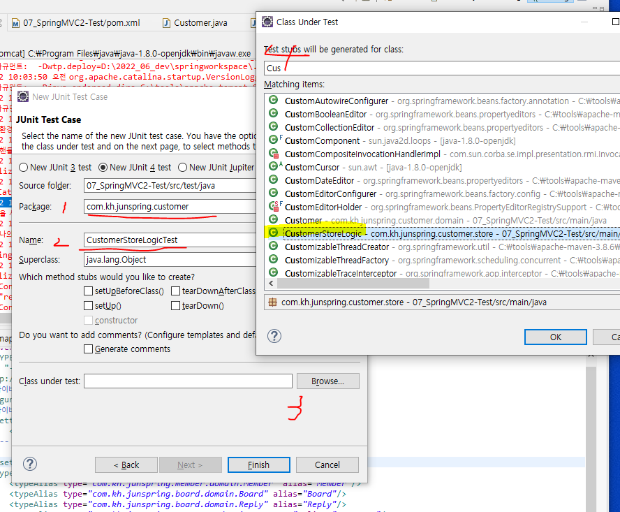 우클릭..new...other .. junit으로 검색해서 test Case 파일로 선택한다.