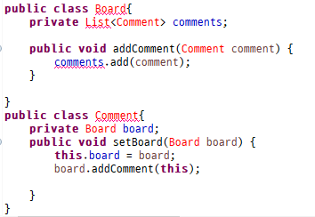 양방향 연관관계를 가지며 1(Board):n(Comment) 의 관계를 표시한 예제