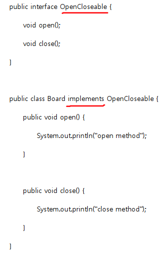 2.Realization(실체화) : interface를 오버라이딩하여 구현한것 / 점선에 비어있는 세모