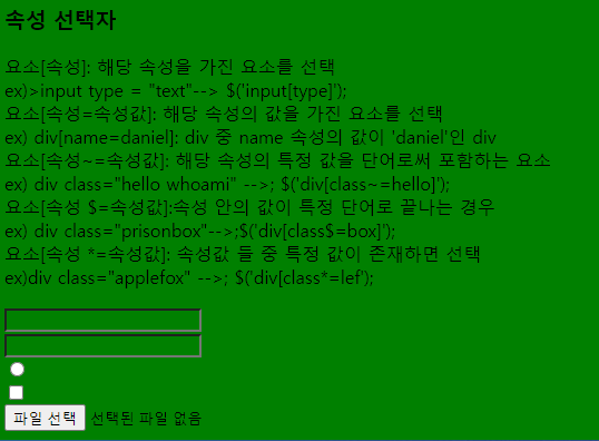 ex) div class="hello whoami" -->; $('div[class~=hello]'); <br>