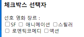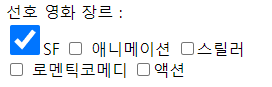 <input type="checkbox" name="genre" id="thriller">스릴러