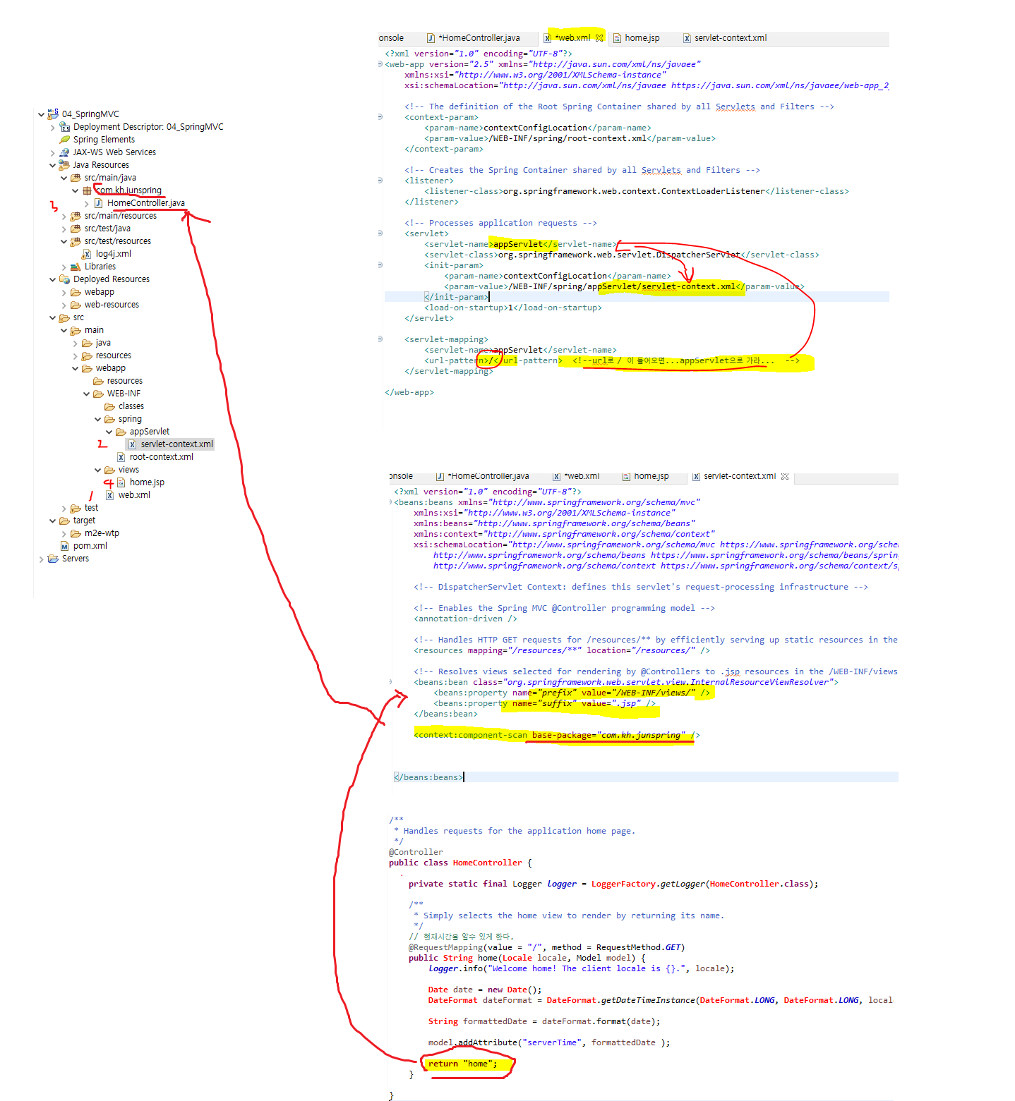 web.xml 1차 가고 매핑에 따라 . servlet의 appServlet-context.xml rksek.